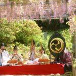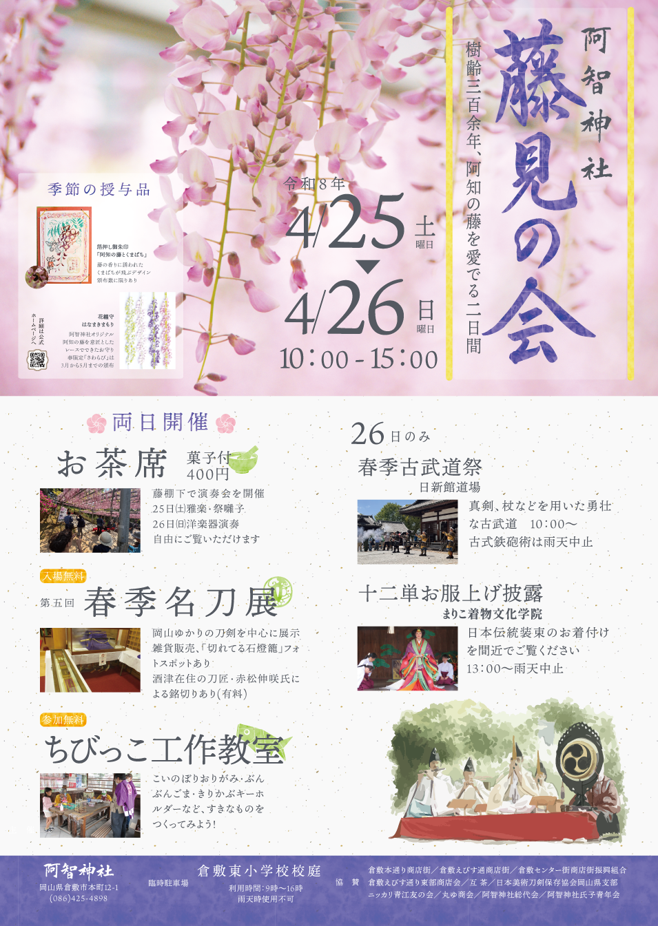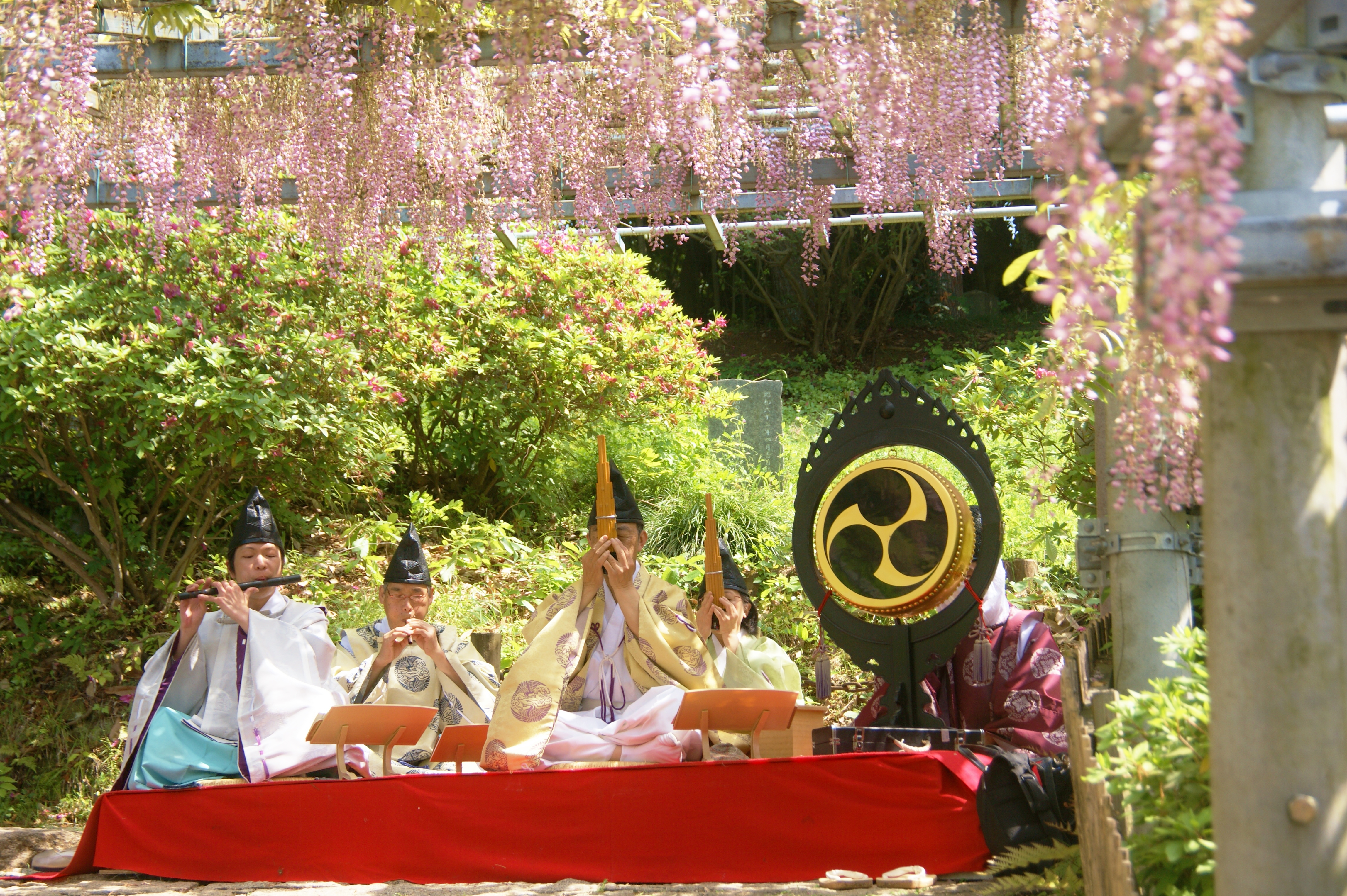 会期中はこの阿知の藤棚下に特設舞台を設け、お茶席(有料400円)や雅楽演奏をはじめ洋の東西を問わず様々な音楽を楽しむことができます。会期中は境内祈祷殿にて日本刀の展示(入場無料)も企画。どうぞお誘いあわせの上ご参拝ください。