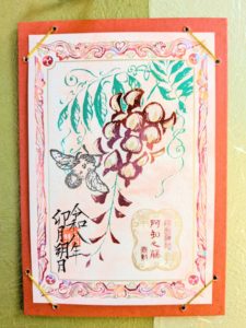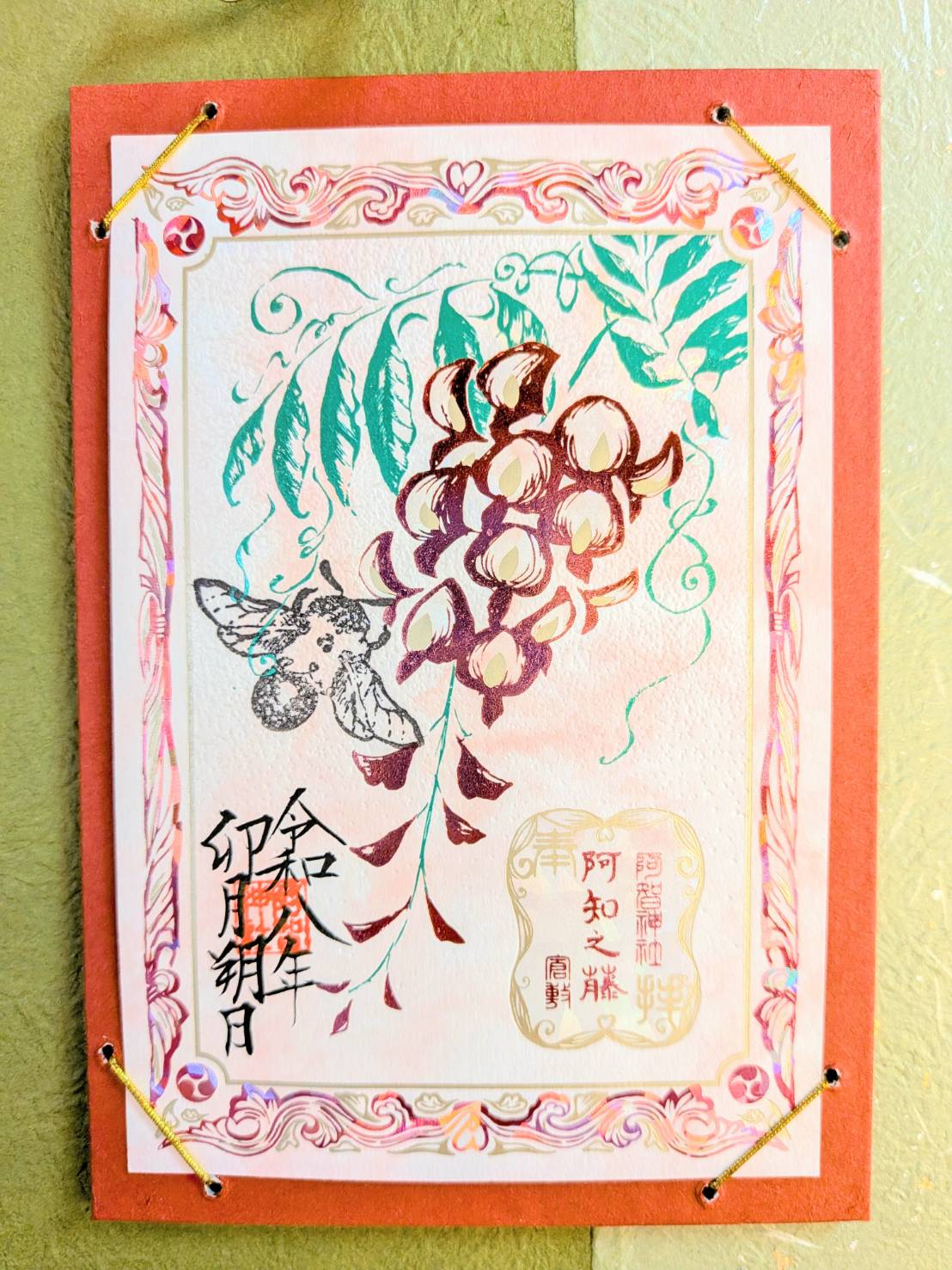 4/1より箔押し御朱印「阿知の藤とくまばち」を頒布いたします。薄紅色の花を咲かせた阿知の藤の甘い香りに誘われてくまばちが遊ぶ様子がデザインされています。は色とりどりの箔を用いて奉製しており、その版数はなんと5版!大変煌びやかで上品な仕上がりです。