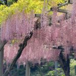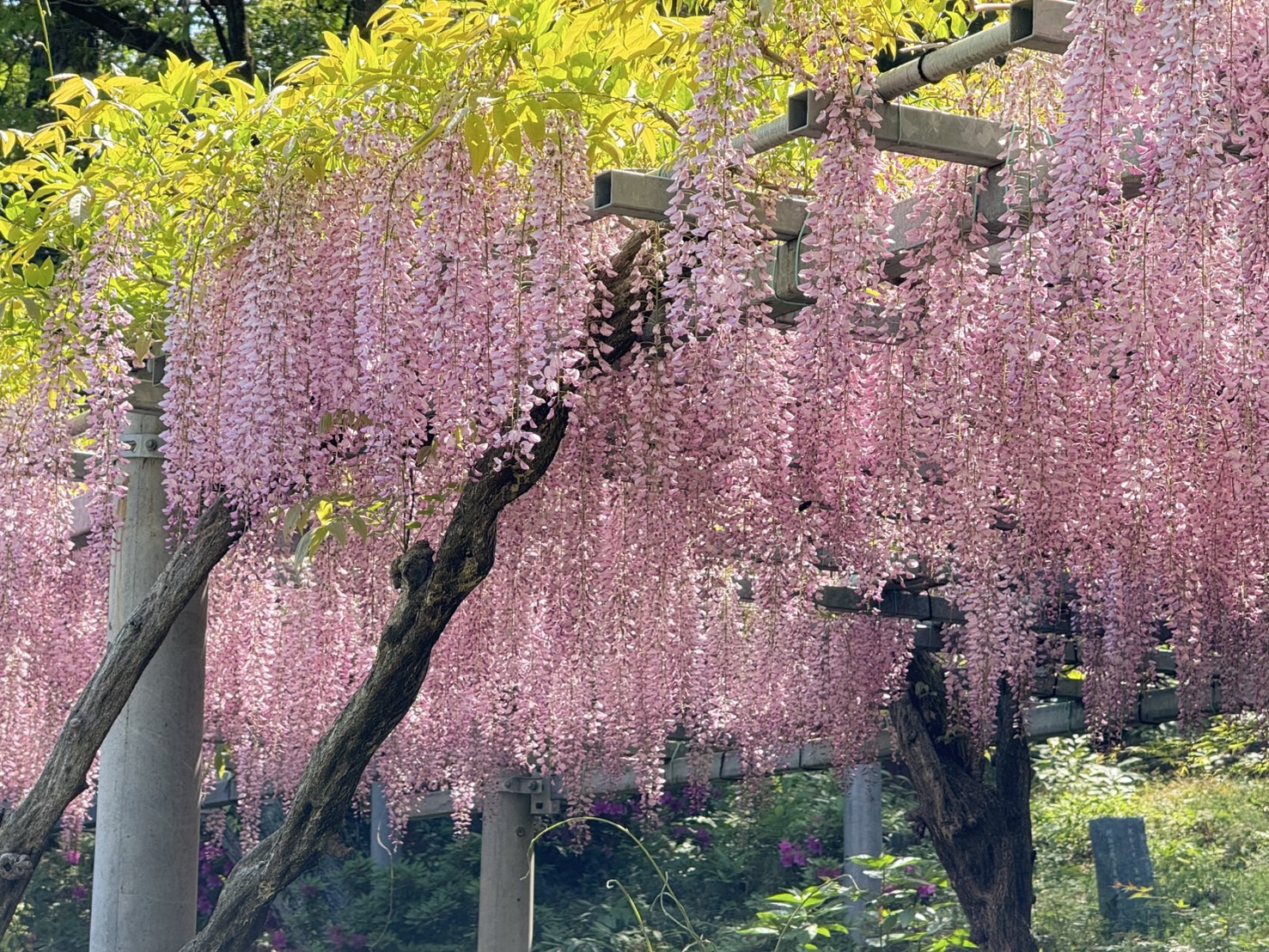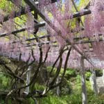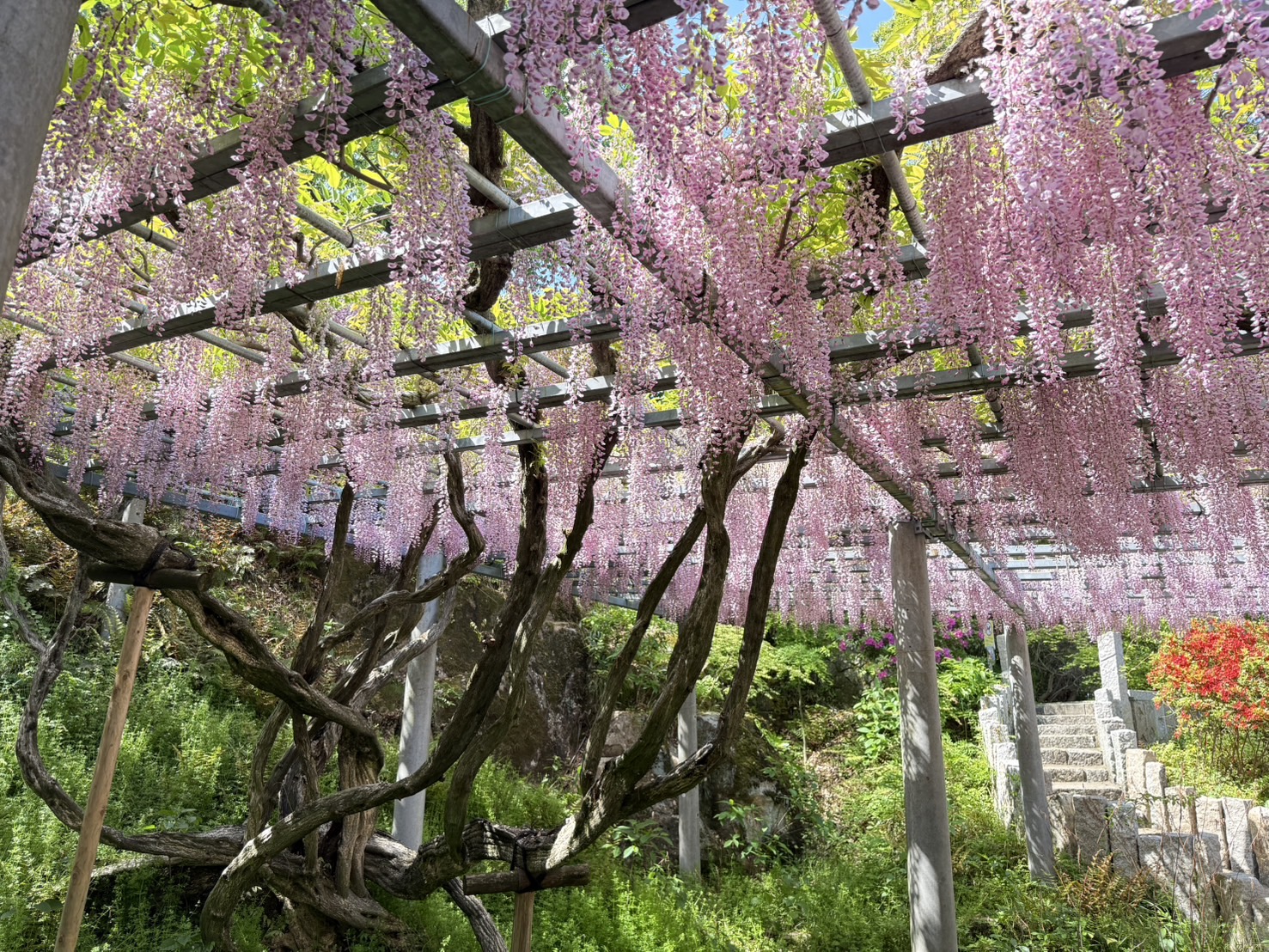 「阿知の藤」は樹齢300から500年のアケボノフジと呼ばれる品種の藤で、その花の色は一般的に想像する紫色ではなく薄紅色の可憐な花を咲かせます。